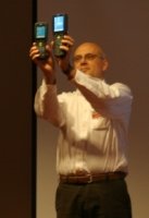 Na zdjęciu obok Prezydent LXE Philip Bechet prezentuje prototyp terminala MX8 w porównaniu do większego brata, terminala MX7.