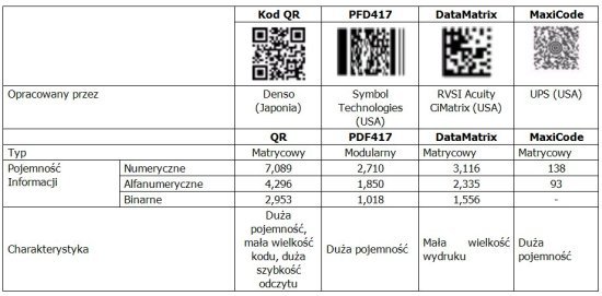 Po opracowaniu Kodu QR powstało jeszcze kilka innych kodów 2D. Każdy z nich inaczej wygląda ma inne możliwości i właściwości. W poniższej tabeli porównano najczęściej stosowane kody dwuwymiarowe.