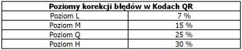 Możliwe jest zastosowanie w kodzie czterech poziomów korekcji błędów w zależności np. od warunków otoczenia, w jakim używane są kody. Im większy zastosujemy poziom odporności na uszkodzenia, tym lepsza będzie tolerancja błędów, ale zarazem zwiększy się wielkość kodu. Poziom Q lub H powinien być stosowany w warunkach przemysłowych, gdzie kody często ulegają zabrudzeniom, natomiast poziom L powinien być wystarczający w czystych środowiskach, gdzie koduje się duże ilości informacji. Najczęściej używany jest poziom M (15%).